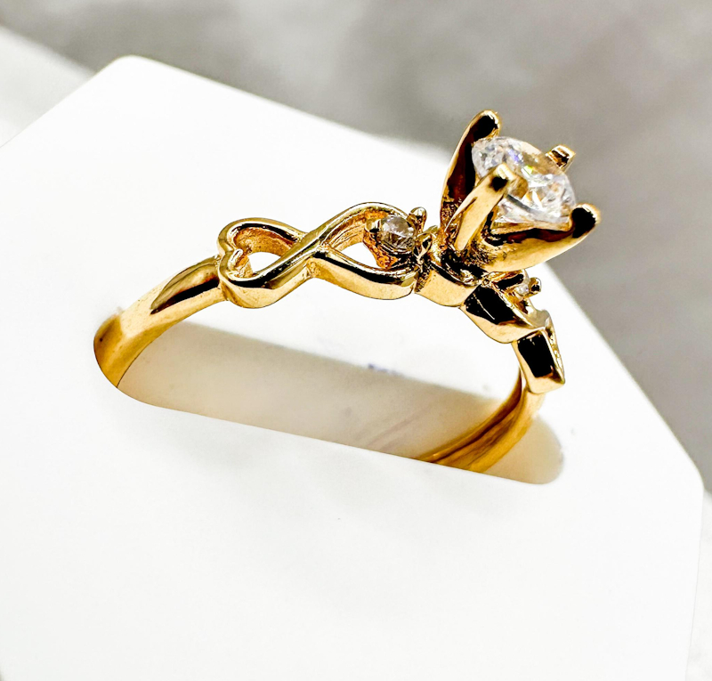Anillo de oro de 18K talla 6.75 con circon blanco central y símbolos de corazón e infinito. Amor eterno y luz.